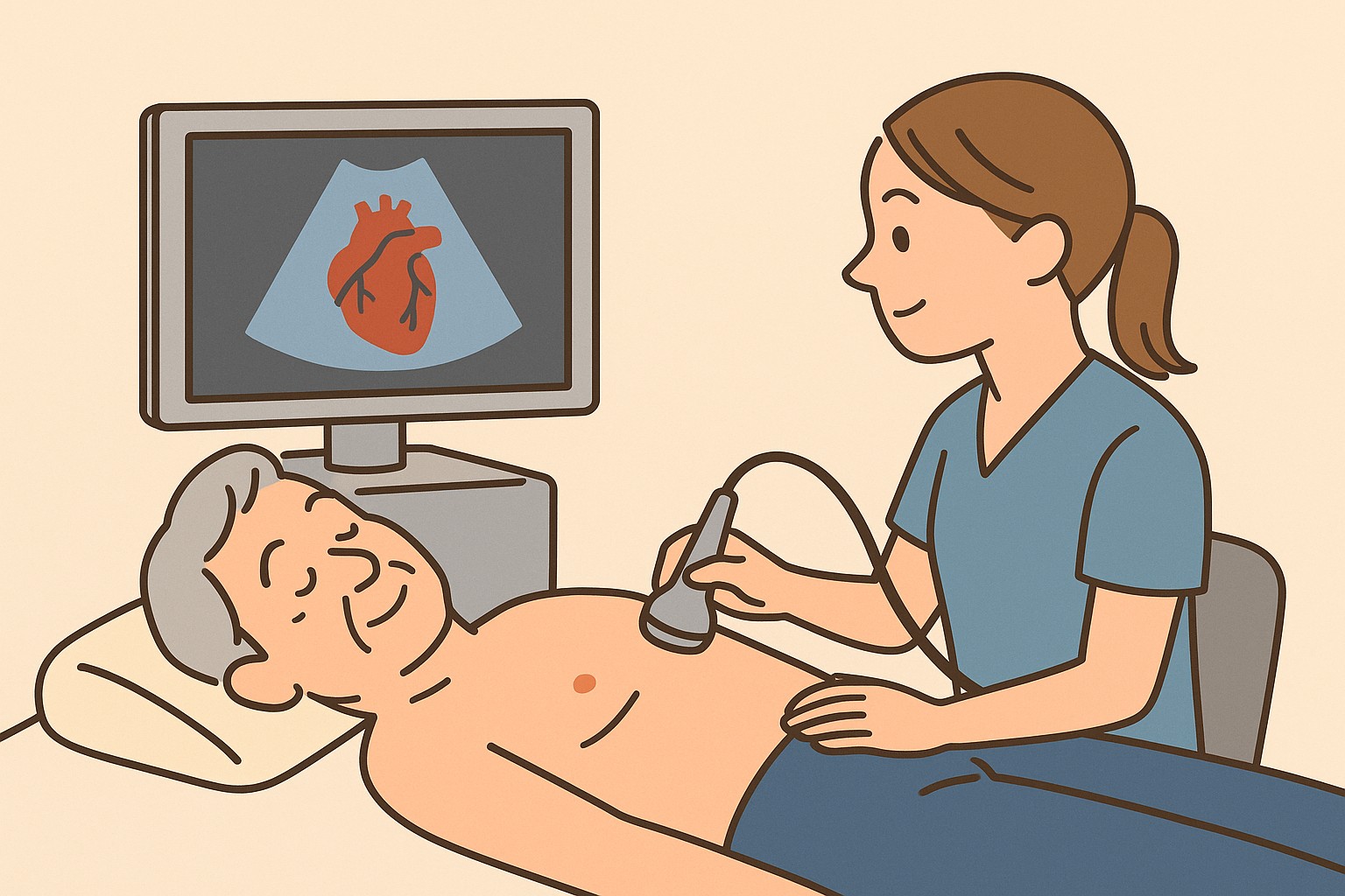 胸にプローブという機械を当てて、超音波で心臓の動きを見る検査です。
