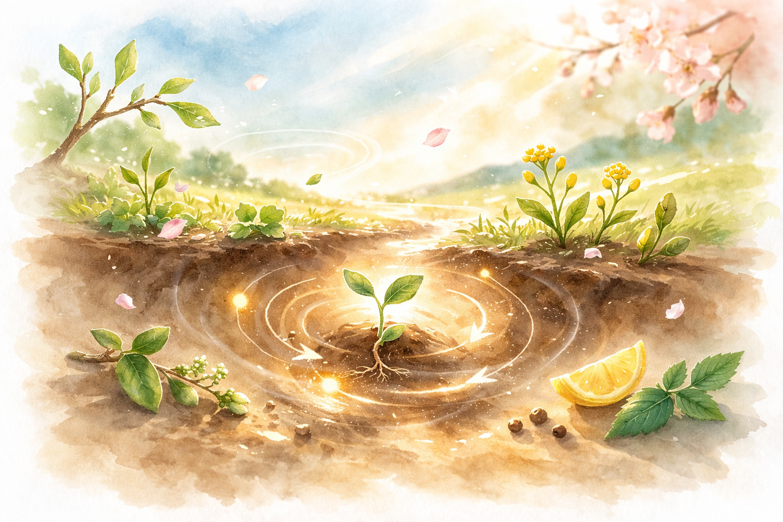 菜の花や春菊などの苦みは、春の高ぶりやすい体を落ち着かせる助けになります。酢の物やレモンなどの酸味も、巡りを支える食材です。
