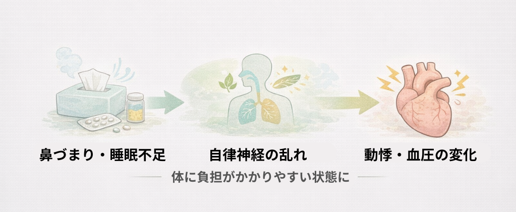 ここで大切なのは、花粉症そのものが心臓の病気を引き起こすという意味ではない、という点です。花粉症による体のだるさや生活リズムの乱れが、体の負担として表に出てくる、という捉え方になります。