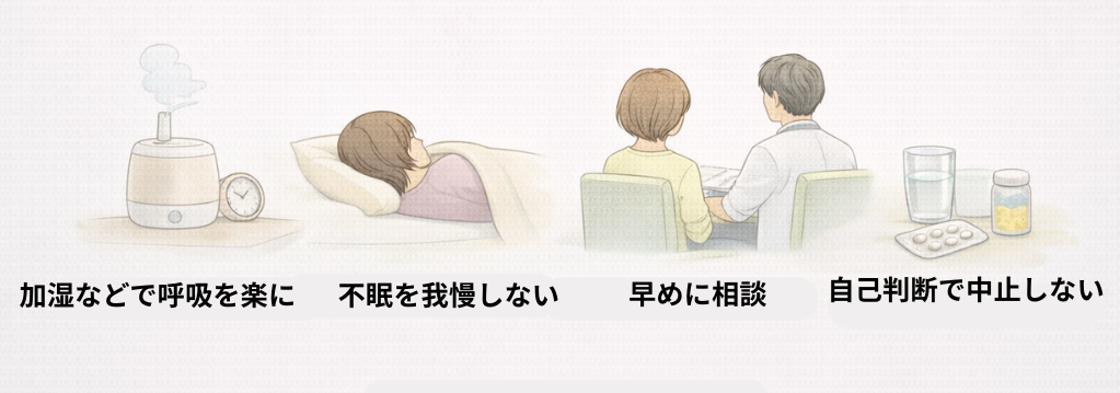 ・夜は加湿などで呼吸を楽にする